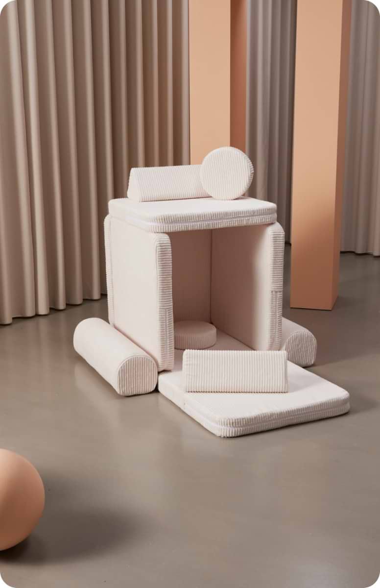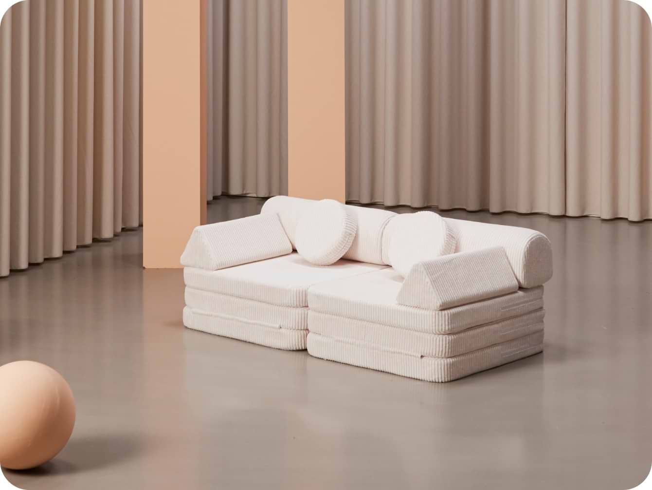 Lekesofaen består av to store puter som kan brettes sammen på midten, to store individuelle puter og 6 mindre puter i morsomme, unike former.