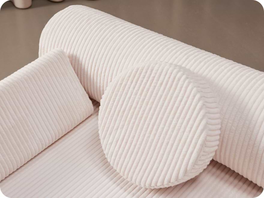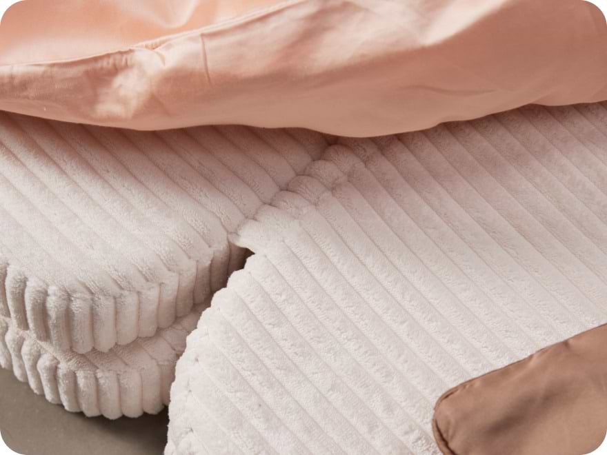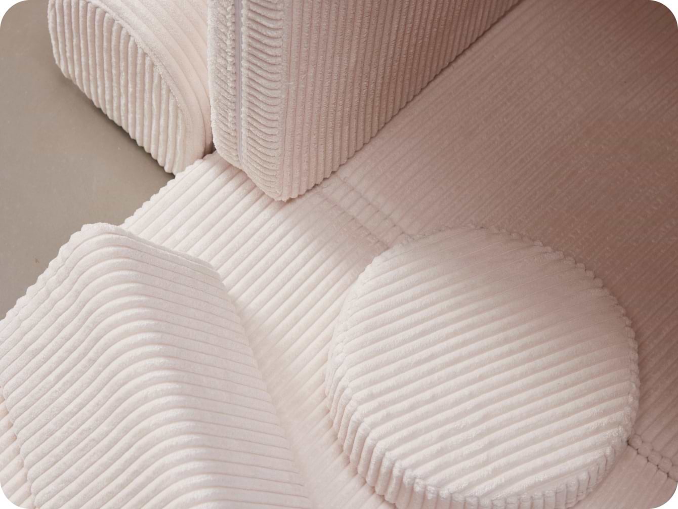 Alle putene er laget av solid skum, som er designet for å tåle små, aktive barns hopping og kasting. Skumputene er dekket med en myk velur som både føles behagelig mot huden og lett kan tørkes av med en varm, fuktig klut når uhellet er ute.